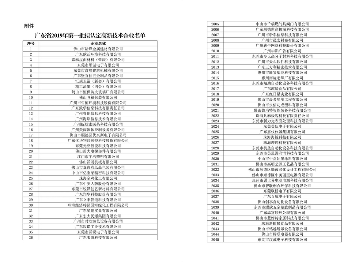 漢高科技、立豐管道榮列廣東省2019年第一批擬認(rèn)定高新技術(shù)企業(yè)名單