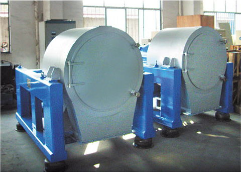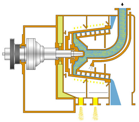 錐形轉(zhuǎn)鼓內(nèi)套裝有同心的卸料螺旋,兩者高速同向旋轉(zhuǎn)的同時又有一定的轉(zhuǎn)速差,該轉(zhuǎn)速差由傳動系統(tǒng)及差速器產(chǎn)生。懸浮液由進料管連續(xù)引入并均勻分布到轉(zhuǎn)鼓內(nèi)端錐面上,在離心力的作用下,液相物穿過濾網(wǎng)和轉(zhuǎn)鼓壁濾孔排出轉(zhuǎn)鼓,經(jīng)排液口排出機外。固相物被截留在濾網(wǎng)內(nèi)形成濾渣,濾渣在離心力的錐面分力和卸料螺旋的共同作用下,連續(xù)地向轉(zhuǎn)鼓大端移動排出轉(zhuǎn)鼓,經(jīng)卸料槽排出機外,從而實現(xiàn)懸浮液的固液分離。