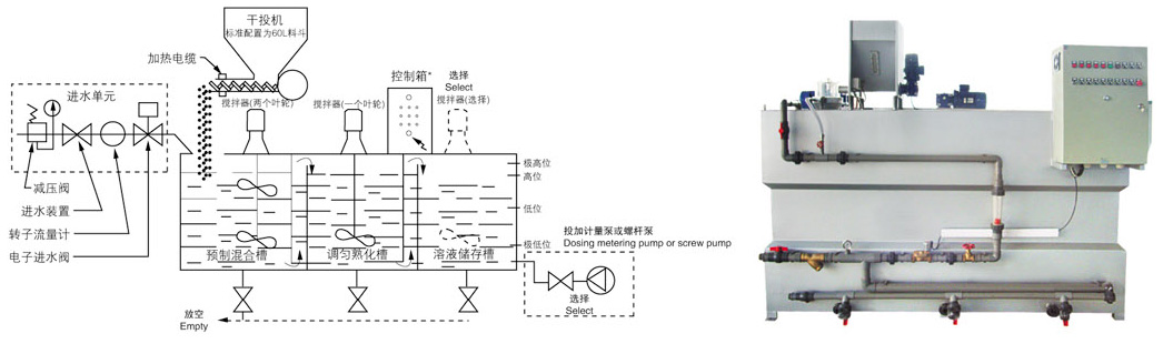 也有分批制備和投加功能的二槽式機型,或半自動制備系統(tǒng),簡易型溶液藥裝置。